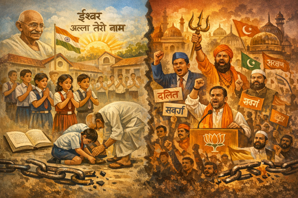 हममें से जितने भी लोग नब्बे के दशक में सरकारी या निजी स्कूलों में पढ़े हैं उनको याद होगा सुबह के समय असेंबली की शुरुआत प्रार्थना से और राष्ट्गान से होता था और समापन पीटी से होती थी और अंत में सभी शिक्षकों का चरण स्पर्श अभिवादन करके ही घर के लिए प्रस्थान होता था। हालांकि बचपन में संविधान की कोई समझ ना थी परंतु यह ज्ञान था कि स्कूल में सभी धर्म के बच्चे हैं फिर भी प्रार्थना एक ही करवाते थे क्यूंकि तब गाँधी जी के आदर्श प्रासंगिक थे और कांसेप्ट था ईश्वर अल्ला तेरो नाम सबको सनमति दें भगवान , किसी और धर्म की प्रार्थना क्यों नहीं कराई जाती थी ? क्यूंकि तब धार्मिक कट्टरता शून्य थी, अनपढ़ पांच हजार साल के प्यासे बिना पानी वाले जीवों की कोई उत्पत्ति नही थी, नवबौद्ध नाम की कोई प्रजाति नहीं थी, भाजपा में ओबीसी नेतृत्व नहीं था और सबका भाईचारा एक नंबर का था । अचानक मायावती अखिलेश अमित शाह जैसे जातिवादी नेता राजनीति के पटल पर आए । मन में सवाल तब तक रहा जब तक अन्य जाति के लोगो ने सिविल सर्विस की तैयारी शुरू नहीं की। जैसे ही कक्षा में संविधान का मौलिक अधिकार का चैप्टर शुरू हुआ तुरंत शिक्षक से पूछा कि क्या स्कूलों में धार्मिक प्रार्थना स्वीकार्य है ? तब कांग्रेस सत्ता में थी उन्होंने मुस्कुरा कर संविधान का अर्टिकल 28 समझाया जो कि इस प्रकार है पूरी तरह से राज्य निधि से संचालित किसी भी शैक्षणिक संस्थान में कोई धार्मिक शिक्षा प्रदान नहीं की जाएगी। और अगर किसी गैर सरकारी स्कूल में धार्मिक प्रार्थना कराई जाए तो बिना परिजनों की अनुमति के किसी बच्चे को प्रार्थना में शामिल नहीं किया जा सकता। सुनकर अचंभित से ज्यादा बुरा नही लगा क्योंकि अनैश्वरवादी होने के बावजूद उस समय राजनीती कुछ न कर सका। हालांकि अब जो लिख रहा हूँ वो स्कूल के लेवल पर नहीं बल्कि देश के लेवल का मसला है। भारतीय लोगों की संवैधानिक शुचितावादी सोच केवल कोरा पाखंड है। चारों ओर नकली जातिवादी वंदन और कीर्तन चल रहे है, शादी ब्याह के मंडपो में संविधान पढ़ा जा रहा और मस्जिदों में भारत का बच्चा-बच्चा श्री राम से गुंज रहा है, लोग आपदा में अवसर जैसे वाक्य इस्तेमाल करते हैं अपनों के बीच, युद्ध में मौतें बंटी हुई हैं, बलात्कार संस्कृति के उन हिस्सों में जायज है जहां रसूखदारों की अहमियत कानून से बड़ी है। सनातन अखंड पाठ से फलता फूलता है और अब समाज अखंड पाखंड से फल फूल रहा। नवबौद्धइज्म के नाम पर इस देश ने मासूम बच्चियों और बुजुर्ग महिलाओं की अस्मिता को सबसे ज्यादा तार-तार किया गया है। इसके बावजूद हर दिन गर्व करने वालों और सनातन संस्कृति की दुहाई देने वालों की फौज बढ़ती जा रही है। मुक्तिबोध के शब्दों में यही बात आती है । मर गया देश, अरे जीवित रह गये तुम।